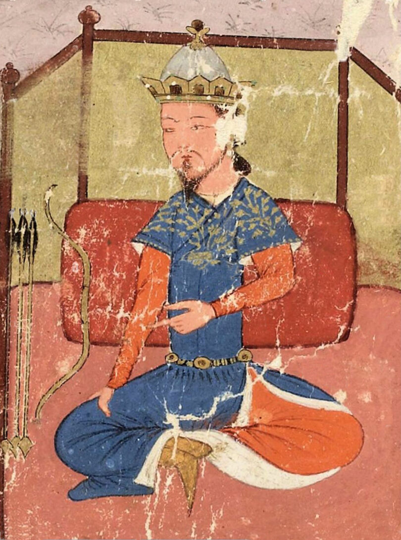 Oğuz Kağan bir taht üzerinde Türk usulü Bağdaş Kurup oturmuştur. Sağ tarafında mitolojide adı geçen 3 Ok ve 1 Yay tasvir edilmiştir. Okların ucu Hilal şeklindedir. Mitolojide, Oğuzun oğulları ava giderler. Üç altın ok ve altın bir yay bulurlar ve babalarına getiriler. Oğuz Altın Yay’ı üç büyük oğluna verir. 3 Altın Ok’u ise küçük oğulları arasında pay eder. Yay’ı parçalayarak verdiği 3 oğlundan gelecek boylara Boz Ok, ok verdiği oğullarından gelecek boylara ise Üç Ok adını verir.
